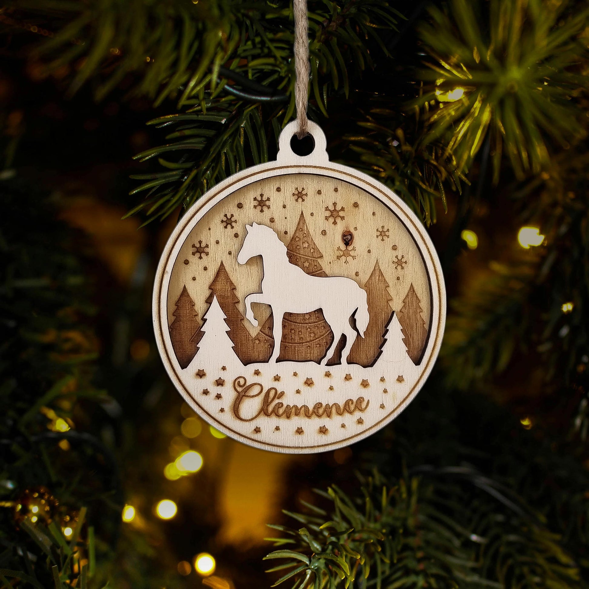 Ajoutez une touche personnelle à votre arbre de Noël avec notre Boule de Noël en Bois "Cheval" avec Prénom Personnalisé.