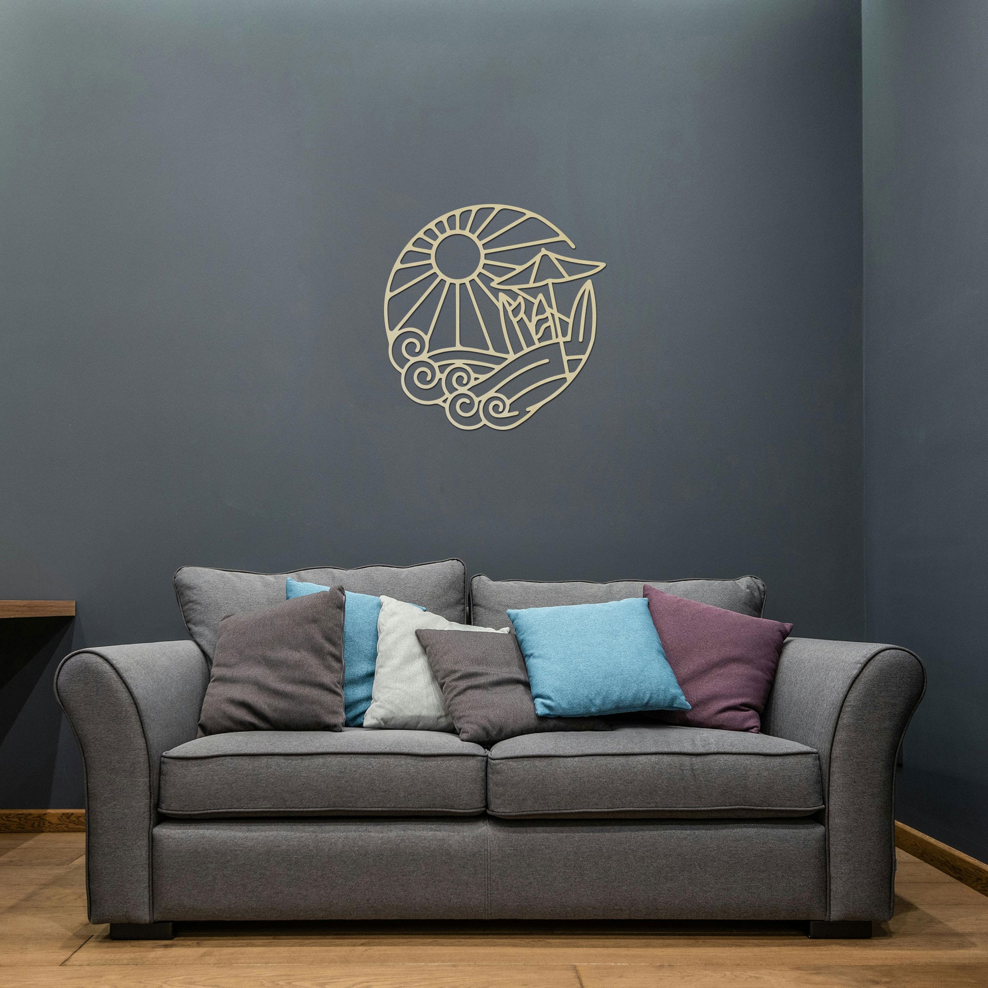 Avec son design rond rappelant les vagues et le soleil, ses planches de surf et son parasol, ce tableau fabriqué en bois français invite à l'abandon sur la plage.