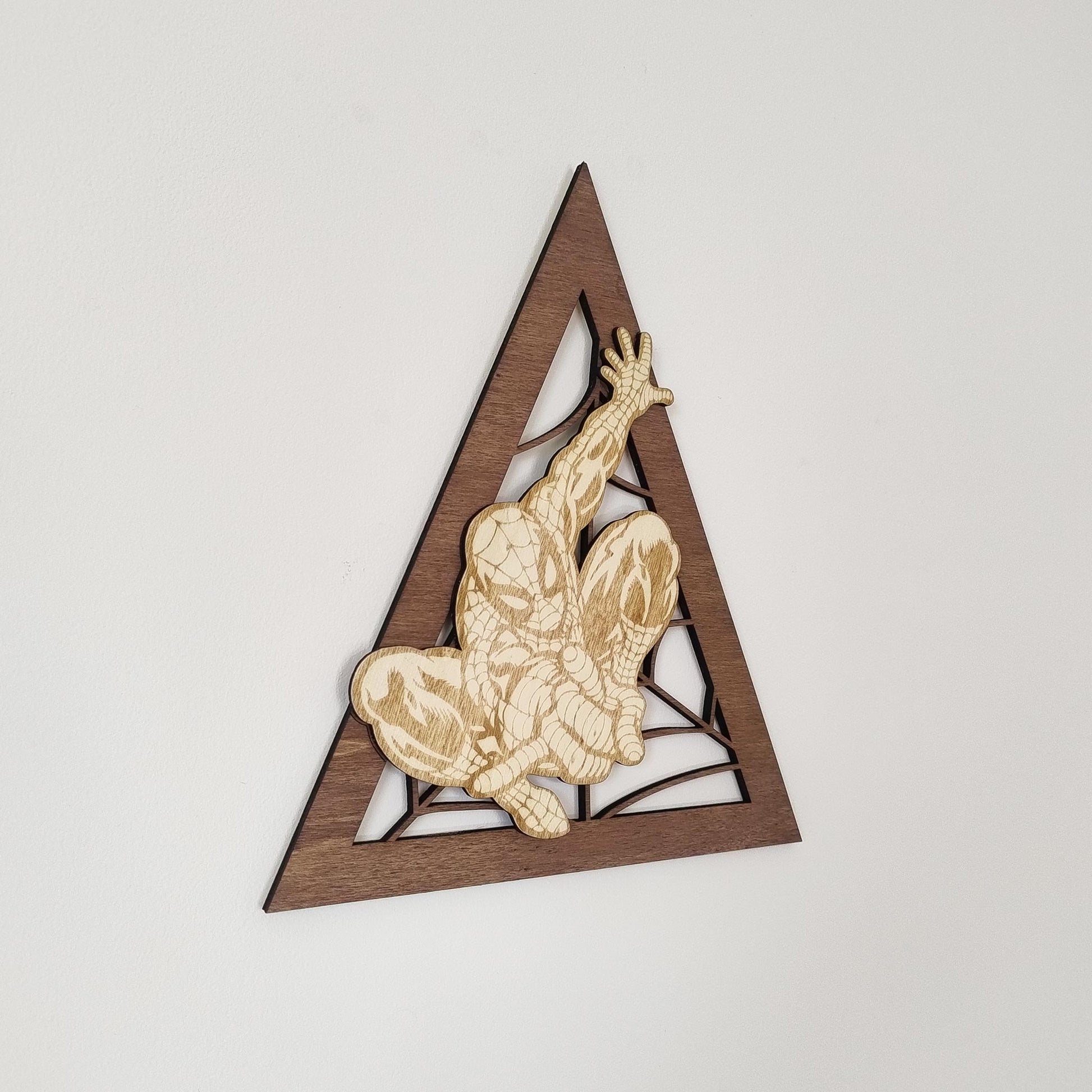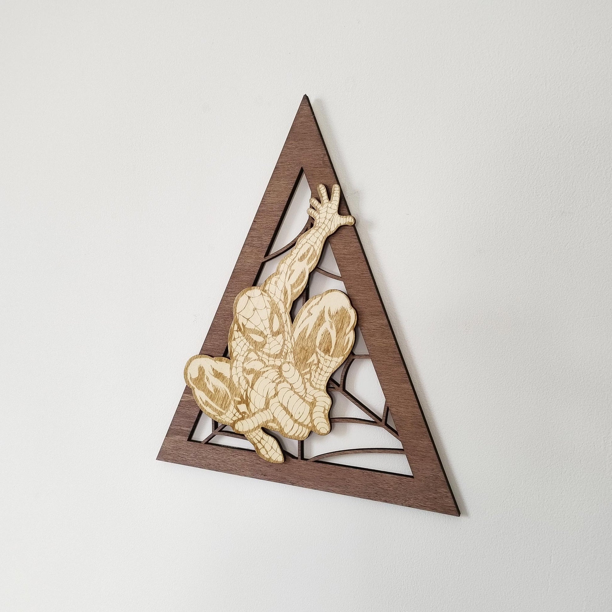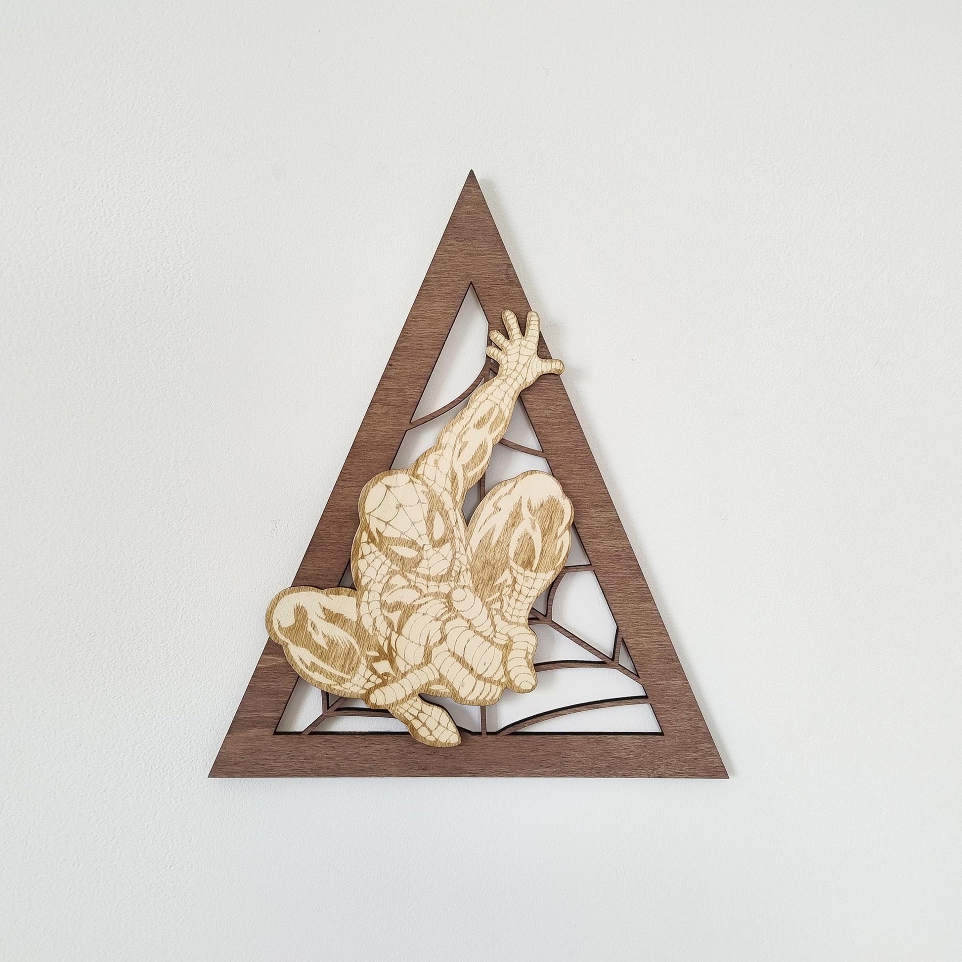 Ce tableau en bois en deux couches représente l'homme araignée Spider-Man accroché à sa toile.